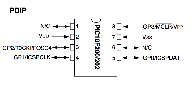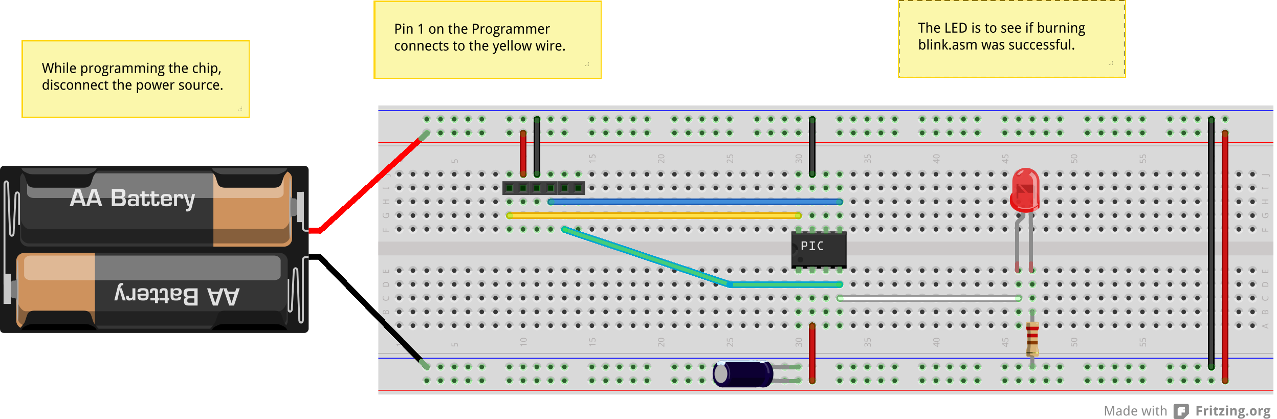 Here's a diagram of how the breadboard should be set up to program the PIC10F200 chip. The breadboard can be powered by any power source, but the voltage should be between 3 and 7 volts.