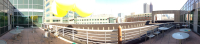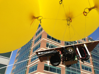 Tethered weather balloons with attached video cameras above the Technology Square Research Building. These cameras moved up and down the balloon line and captured a 360-degree panoramic view of Midtown Atlanta. The real time video streaming was then projected inside one of the TSRB elevators, which allows Ascent participants to view the city as they ride the elevator as if they were perched on the balloon cluster above the building.